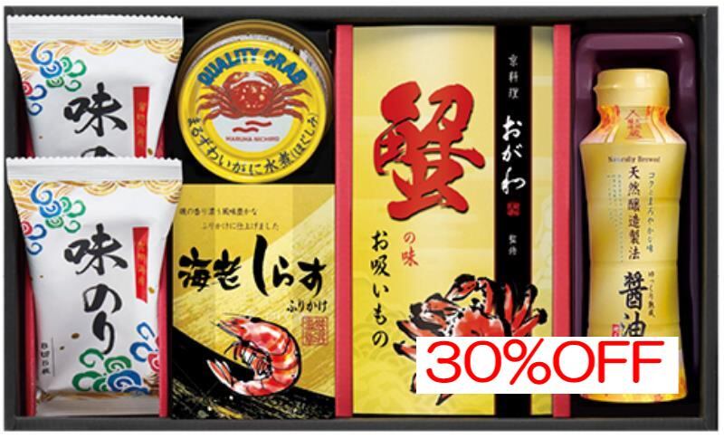 商品内容:内容/蟹の味お吸いもの:3.8g×3袋×1・海老しらすふりかけ:3g×3袋×1・有明海産味のり:8切5枚×2・伊賀越天然醸造しょうゆ:200ml×1・まるずわいがにほぐしみ:55g×1《乳・小麦・えび・かに》