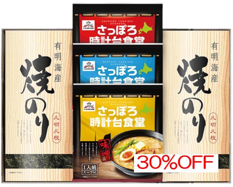 商品内容:内容/さっぽろ時計台食堂らーめん:(味噌・塩・醤油)×各1・有明海産焼のり:8切8枚×3袋×2《卵・小麦》
