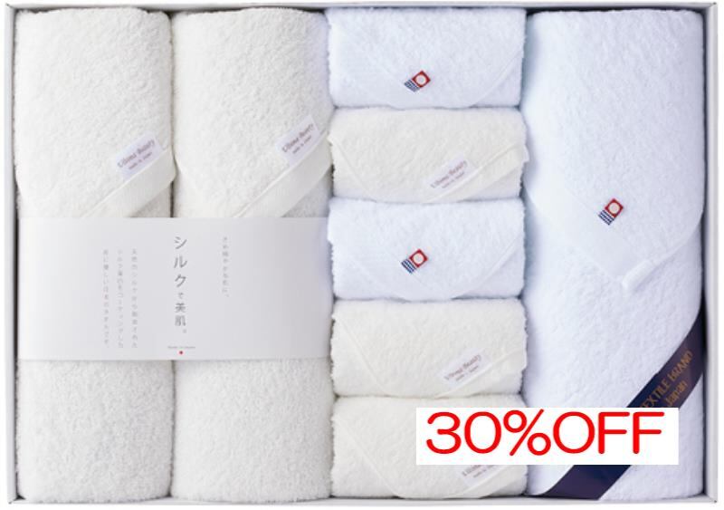 商品内容:内容/ワイドバスタオル(シルクプロテイン加工):68×130㎝×2・バスタオル(今治起毛加工):60×120㎝×1・フェイスタオル(シルクプロテイン加工):33×80㎝×3・フェイスタオル(今治起毛加工):33×75㎝×2