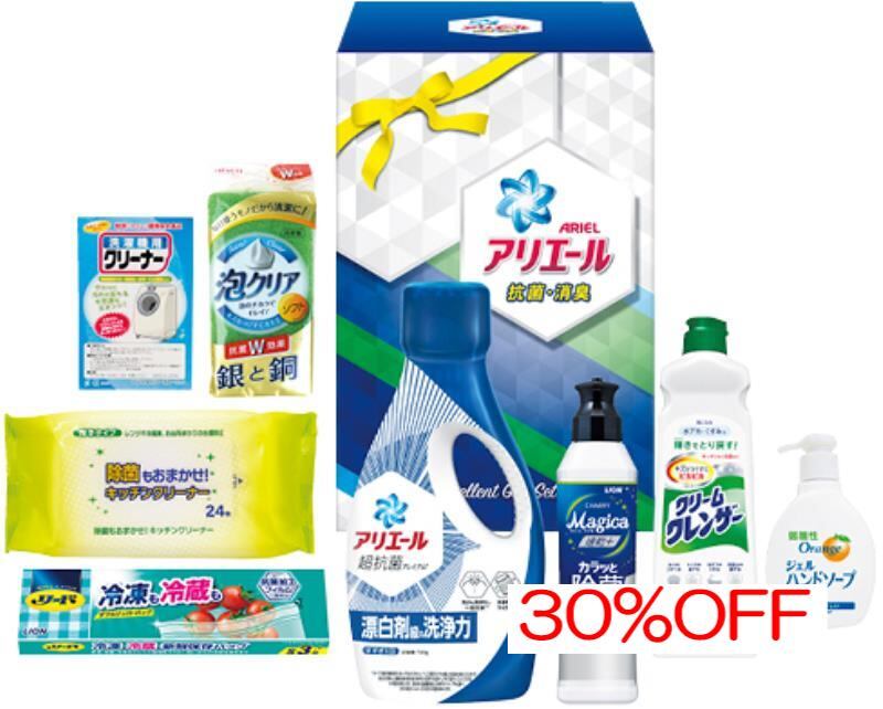 商品内容:内容/P&Gアリエールジェル[日本製]:720g×1・ライオンチャーミーマジカ速乾プラス[日本製]:220ml×1・クリームクレンザー[日本製]:400g×1・除菌キッチンクリーナー[日本製]:24枚×1・ライオンリード冷凍も冷蔵も新鮮保存バッグS[タイ製]:3枚×1・オレンジジェルハンドソープ[日本製]:200ml×1・泡クリアスポンジ[日本製]×1・洗濯機用クリーナーM[日本製]×1