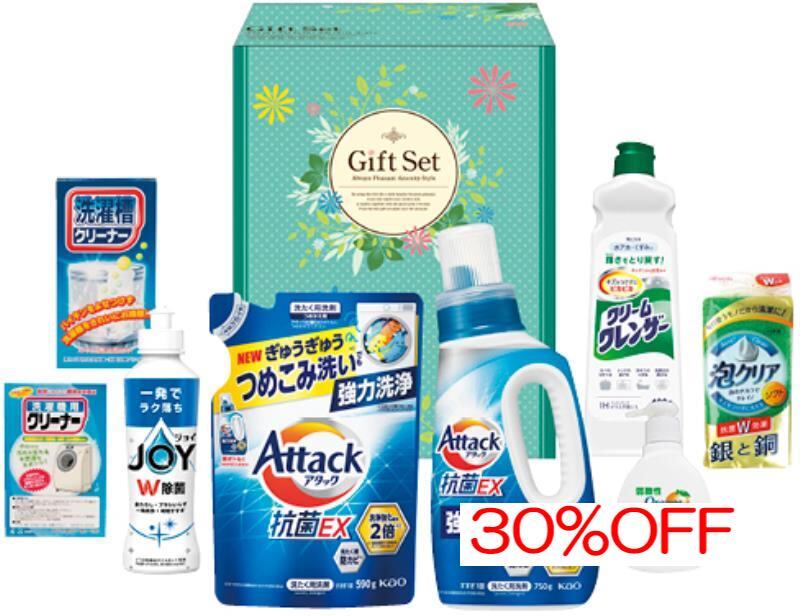 商品内容:内容/花王アタック抗菌EX:750g×1・花王アタック抗菌EX詰め替え用:590g×1・P&G除菌ジョイコンパクト:170ml×1・オレンジジェルハンドソープ:200ml×1・クリームクレンザー:400g×1・洗濯槽クリーナー:5錠×1・洗濯機用クリーナーM×1・泡クリアスポンジ×1
