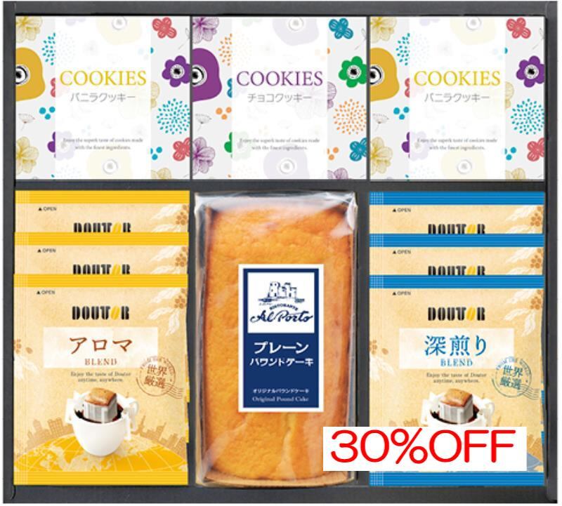 商品内容:内容/プレーンパウンドケーキ×1・ドトールドリップコーヒーアロマブレンド:7g×3・ドトールドリップコーヒー深煎りブレンド:7g×3・バニラクッキー:30g×2・チョコクッキー:30g×1《卵・乳・小麦》