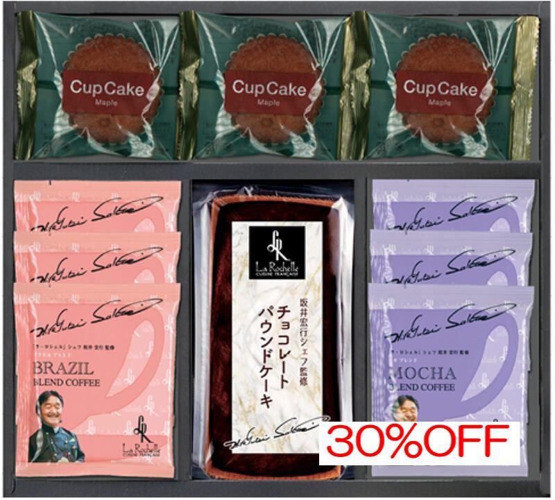 商品内容:内容/坂井宏行シェフ監修(チョコレートパウンドケーキ×1・ドリップコーヒーブラジルブレンド:7g×3・ドリップコーヒーモカブレンド:7g×3)・カップケーキメープル×3《卵・乳・小麦》
