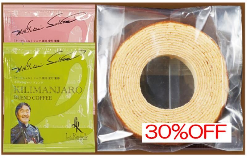 商品内容:内容/ホールバウムクーヘン×1・坂井宏行シェフ監修ドリップコーヒー(ブラジルブレンド)7g×1・坂井宏行シェフ監修ドリップコーヒー(キリマンジャロブレンド)7g×1《卵・乳・小麦》