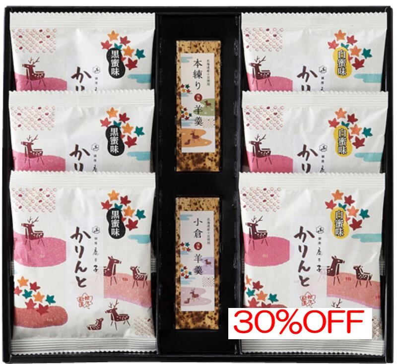 商品内容:内容/黒蜜かりんとう:10g×3・白蜜かりんとう:10g×3・羊羹(小倉):50g×1・羊羹(本練):50g×1《乳・小麦》