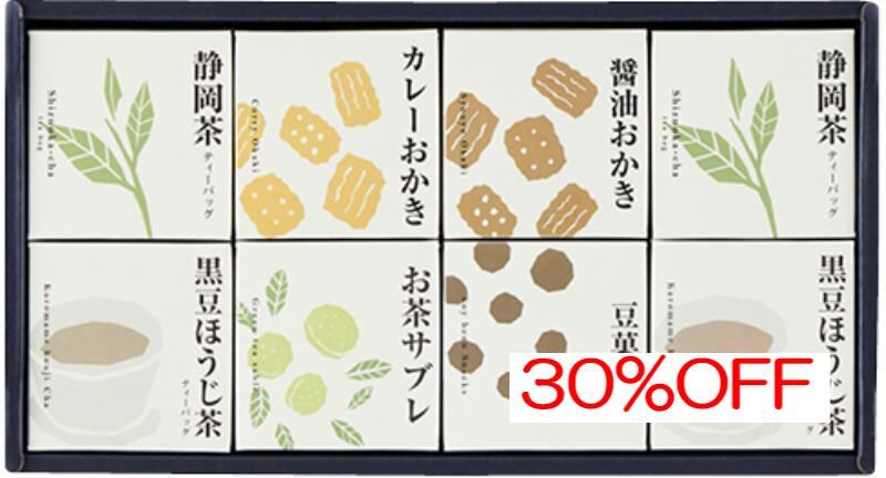 商品内容:内容/緑茶ティーバッグ:2.5g×7P×2・黒豆ほうじ茶ティーバッグ:2.5g×7P×2・豆菓子(黒ごま味):45g×1・カレーおかき:24g×1・醤油おかき:24g×1・お茶サブレ:3本×1《卵・乳・小麦・落花生》