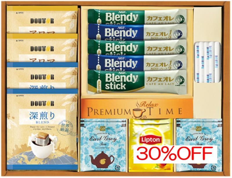 商品内容:内容/ドトールドリップコーヒーアロマブレンド×2・ドトールドリップコーヒー深煎りブレンド×2・リプトンイエローラベル×2・アールグレイ紅茶ティーバッグ×4・ブレンディスティックカフェオレ×3・ブレンディスティックカフェオレ(カロリーハーフ)×2・ドトールスティックシュガー15本×1《乳》