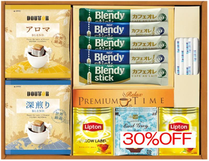商品内容:内容/ドトールドリップコーヒーアロマブレンド×3・ドトールドリップコーヒー深煎りブレンド×3・リプトンイエローラベル×6・アールグレイ紅茶ティーバッグ×3・ブレンディスティックカフェオレ×3・ブレンディスティックカフェオレ(カロリーハーフ)×2・ドトールスティックシュガー15本×1《乳》