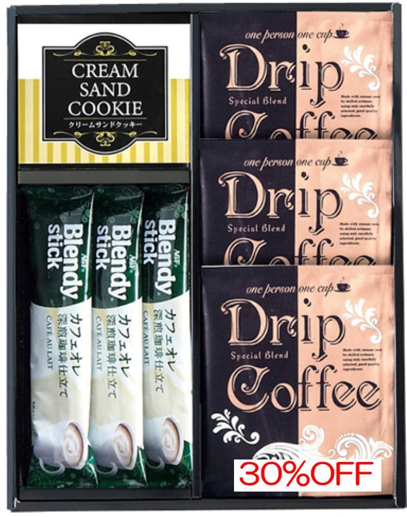 商品内容:内容/ドリップコーヒー:8g×3・クリームサンドクッキー×2・カフェオレ深煎珈琲:14g×3《卵・乳・小麦》