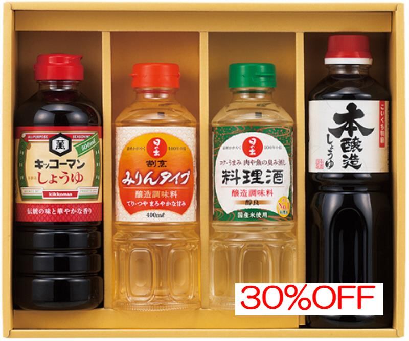 商品内容:内容/キッコーマンこいくちしょうゆ:500ml×1・サンビシ本醸造しょうゆ:500ml×1・日の出料理酒:400ml×1・日の出割烹みりんタイプ:400ml×1《小麦》