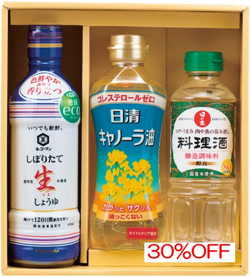 商品内容:内容/キッコーマンいつでも新鮮しぼりたて生しょうゆ:450ml×1・日清キャノーラ油:350g×1・日の出料理酒:400ml×1《小麦》