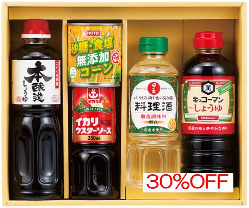 商品内容:内容/キッコーマンこいくちしょうゆ[日本製]:500ml×1・サンビシ本醸造しょうゆ[日本製]:500ml×1・日の出料理酒[日本製]:400ml×1・イカリテーブルウスターソース[日本製]:250ml×1・ホテイ砂糖・食塩無添加コーン[タイ製]:180g×1《小麦》
