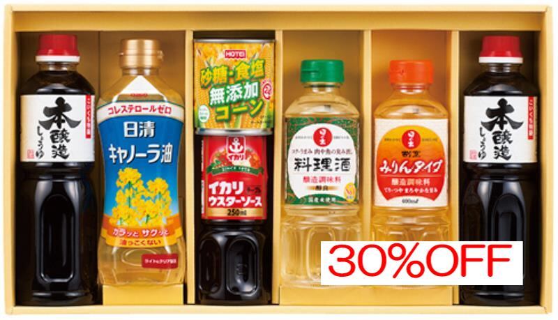商品内容:内容/サンビシ本醸造しょうゆ[日本製]:500ml×2・日清キャノーラ油[日本製]:350g×1・日の出料理酒[日本製]:400ml×1・日の出割烹みりんタイプ[日本製]:400ml×1・イカリテーブルウスターソース[日本製]:250ml×1・ホテイ砂糖・食塩無添加コーン[タイ製]:180g×1《小麦》