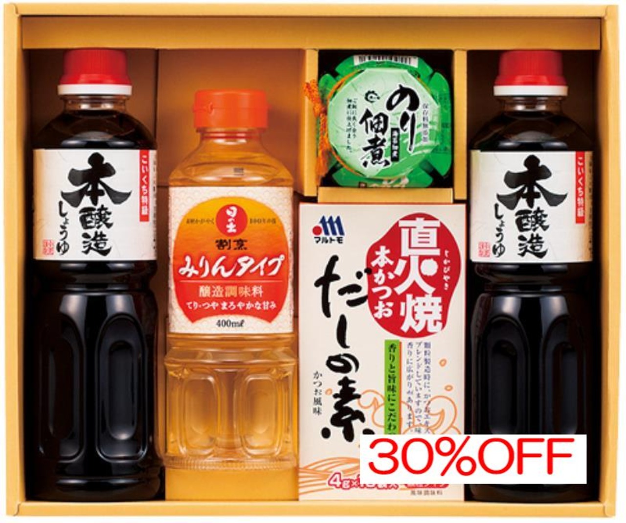 商品内容:内容/サンビシ本醸造しょうゆ:500ml×2・日の出割烹みりんタイプ:400ml×1・島乃香のり佃煮:80g×1・マルトモ直火焼本かつおだしの素:(4g×10袋)×1《乳・小麦》