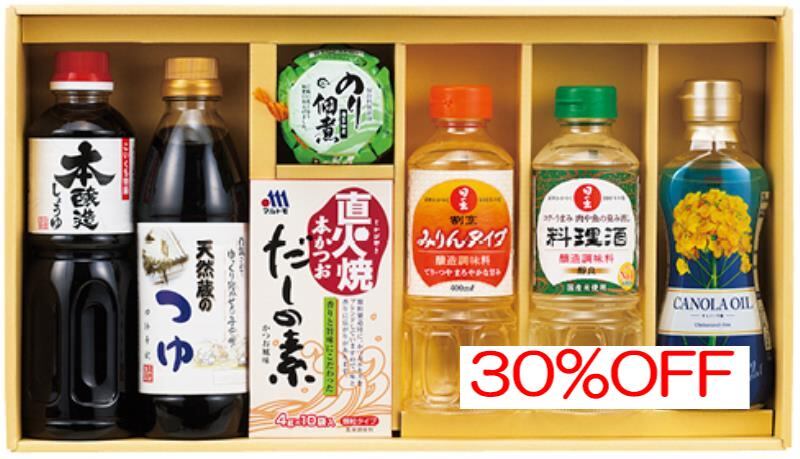商品内容:内容/昭和キャノーラ油:300g×1・サンビシ本醸造しょうゆ:500ml×1・伊賀越天然蔵のつゆ:500ml×1・日の出割烹みりんタイプ:400ml×1・日の出料理酒:400ml×1・島乃香のり佃煮:80g×1・マルトモ直火焼本かつおだしの素:(4g×10袋)×1《乳・小麦》