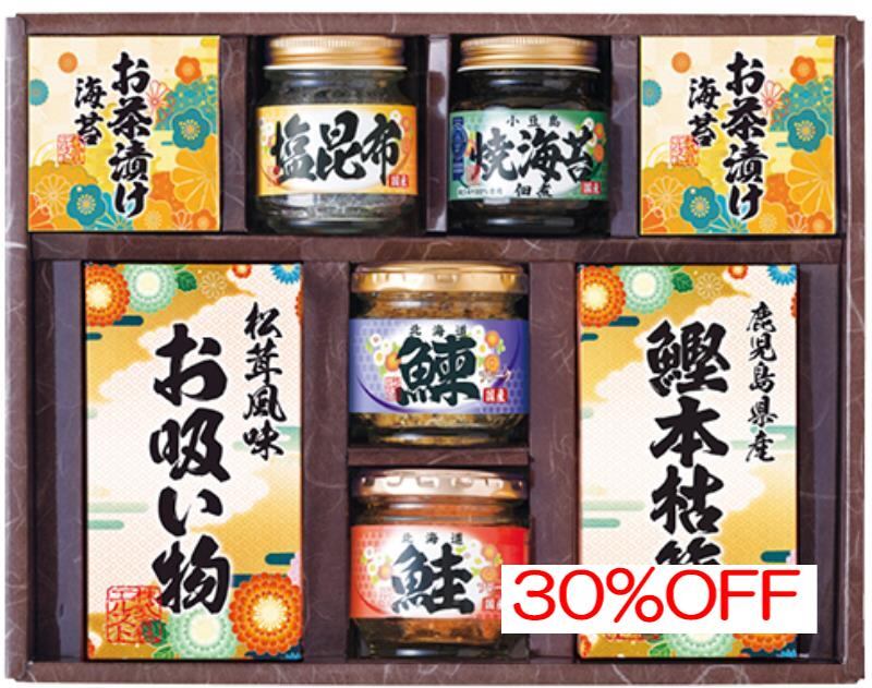商品内容:内容/焼きのり入り佃煮:85g×1・鰹本枯節:2.5g×3袋×1・永谷園お茶づけ海苔:4.7g×2袋×2・永谷園お吸い物松茸風味:2.3g×4袋×1・塩昆布:18g×1・鮭フレーク:40g×1・にしんフレーク:50g×1《小麦》