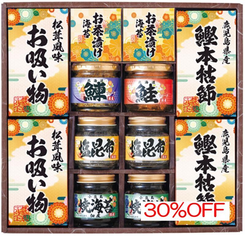 商品内容:内容/焼きのり入り佃煮:85g×2・鰹本枯節:2.5g×3袋×2・永谷園お茶づけ海苔:4.7g×2袋×2・永谷園お吸い物松茸風味:2.3g×4袋×2・塩昆布:18g×2・鮭フレーク:40g×1・にしんフレーク:50g×1《小麦》
