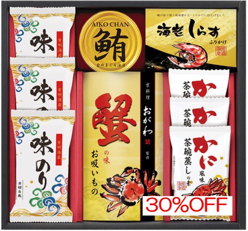 商品内容:内容/蟹の味お吸いもの:3.8g×3袋×1・有明海産味のり:8切5枚×3・鮪油漬フレーク:70g×1・海老しらすふりかけ:3g×3袋×1・かに風味茶碗蒸しの素×3《乳・小麦・えび・かに》