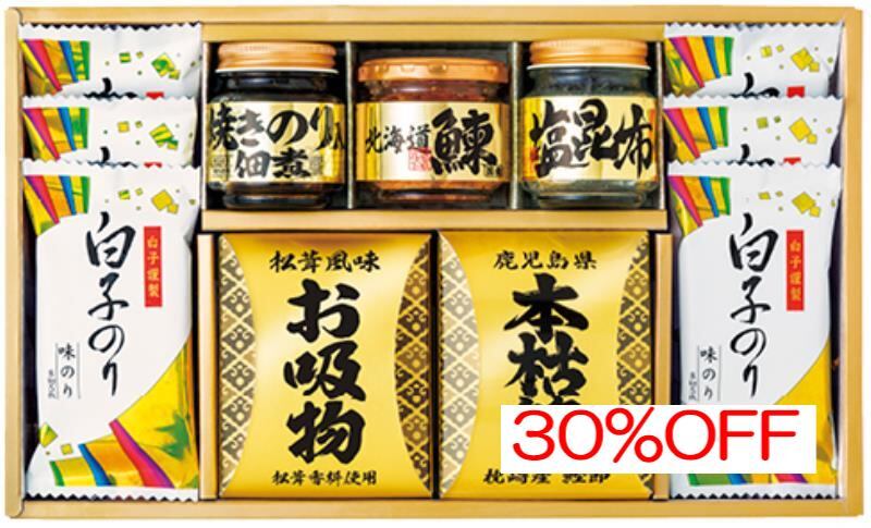 商品内容:内容/鹿児島県枕崎産鰹本枯れ節:2.5g×2袋×1・白子のり味のり:8切5枚×6・焼きのり佃煮:85g×1・松茸風味お吸い物:2.3g×3袋×1・北海道産にしんフレーク50g×1・塩昆布:18g×1《小麦・えび》