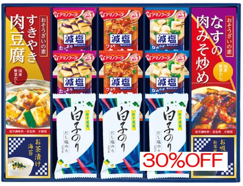 商品内容:内容/白子のりだし塩のり:8切5枚×3・減塩いつものおみそ汁(なす):9g×2・減塩いつものおみそ汁(とうふ):10.3g×2・減塩いつものおみそ汁(なめこ):8g×2・キッコーマンすきやき肉豆腐:140g×1・キッコーマンなすの肉みそ炒め:145g×1・永谷園お茶づけ海苔:4.7g×2袋×1・永谷園お吸いもの松茸風味:2.3g×2袋×1《乳・小麦》