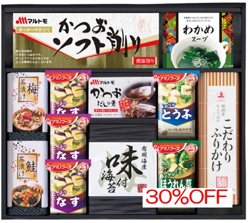 商品内容:内容/マルトモかつおソフト削り:2g×4袋×1・わかめスープ:5.3g×2袋×1・梅茶漬け:4.3g×2袋×1・鮭茶漬け:4.7g×2袋×1・アマノなすおみそ汁:9.5g×3・アマノとうふおみそ汁:10g×1・アマノほうれん草おみそ汁:7g×1・マルトモかつおだしの素:8g×3袋×1・有明海産味付海苔:8切8枚×2袋×1・こだわりふりかけ:6g×3袋×1《乳・小麦・えび》