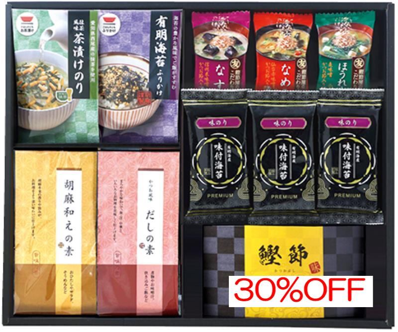 商品内容:内容/有明海苔ふりかけ:5g×2袋×1・抹茶入りのり茶漬け:5.6g×2袋×1・胡麻和えの素:5g×2袋×1・かつお風味だしの素:4g×3袋×1・即席みそ汁(なす):7.4g×1・即席みそ汁(ほうれん草):7.5g×1・即席みそ汁(なめこ):5.9g×1・有明海産味付海苔:8切6枚×3・鰹節:2g×3×1《小麦・乳・えび》