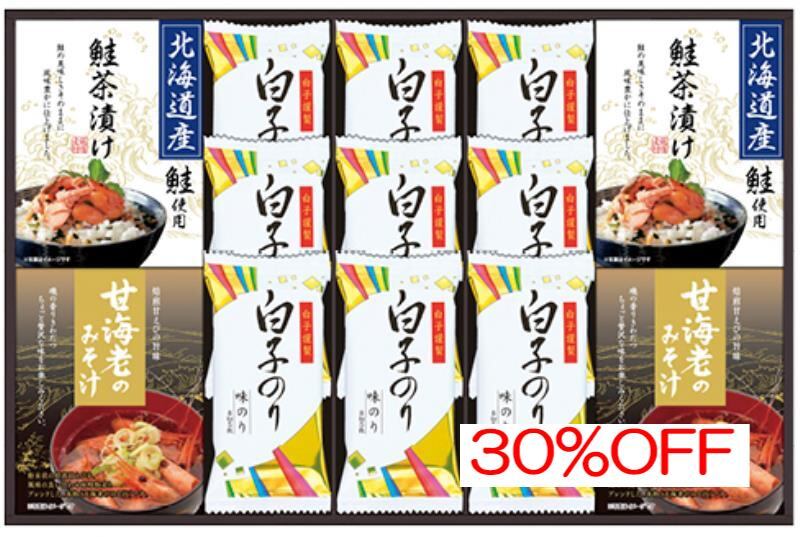 商品内容:内容/甘海老みそ汁:7.5g×3袋×2・北海道産鮭茶漬け:4g×3袋×2・白子のり:8切5枚×9《乳・小麦・えび》