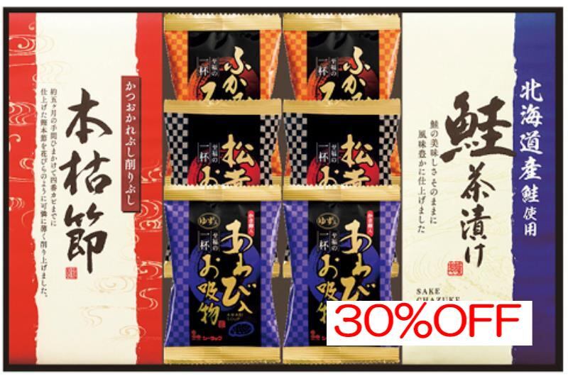 商品内容:内容/あわび入お吸い物:4g×2・松茸のお吸い物:4.2g×2・ふかひれスープ:5.5g×2・北海道産鮭茶漬け:4g×3袋×1・本枯れ節削り節:2g×2袋×1《卵・乳・小麦》