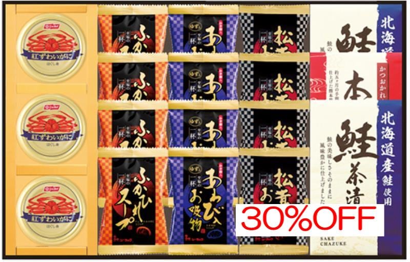 商品内容:内容/あわび入お吸い物:4g×4・松茸のお吸い物:4.2g×4・ふかひれスープ:5.5g×4・紅ずわいがにほぐし身:55g×3・北海道産鮭茶漬け:4g×2袋×2・本枯れ節削り節:2g×2袋×1《卵・乳・小麦・かに》