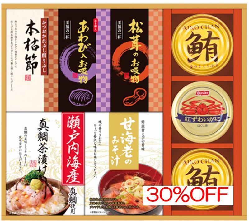商品内容:内容/あわび入お吸い物:4g×1・松茸のお吸い物:4.2g×1・本枯れ節削り節:2g×2・甘海老みそ汁:7.5g×3袋×1・瀬戸内海産真鯛茶漬け:5.1g×3袋×1・紅ずわいがにほぐし身:55g×1・鮪油漬フレーク:70g×2《卵・乳・小麦・えび・かに》