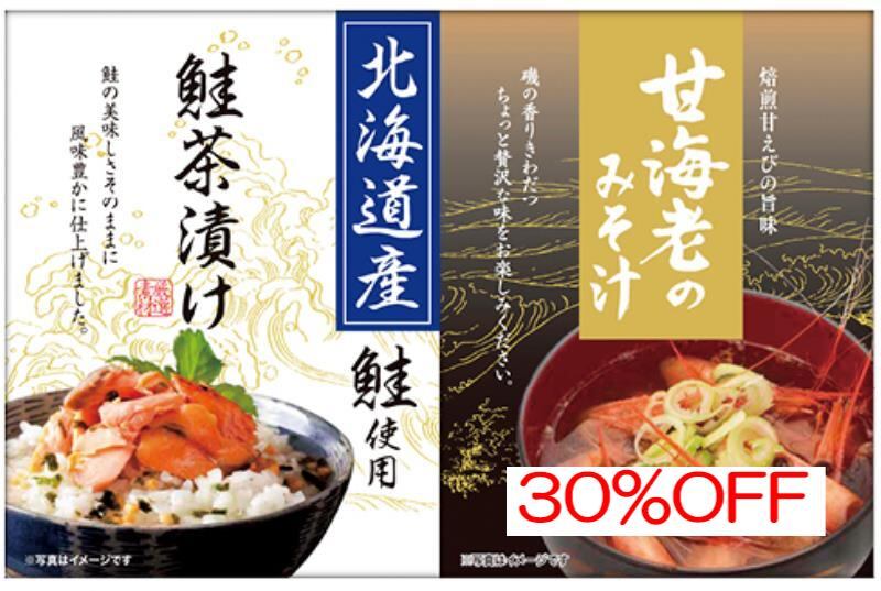商品内容:内容/甘海老みそ汁:7.5g×2・北海道産鮭茶漬け:4g×2《乳・小麦・えび》