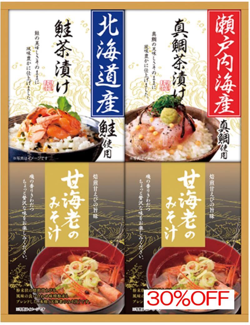 商品内容:内容/甘海老みそ汁:7.5g×3×2・瀬戸内海産真鯛茶漬け:5.1g×3×1・北海道産鮭茶漬け:4g×3×1《乳・小麦・えび》