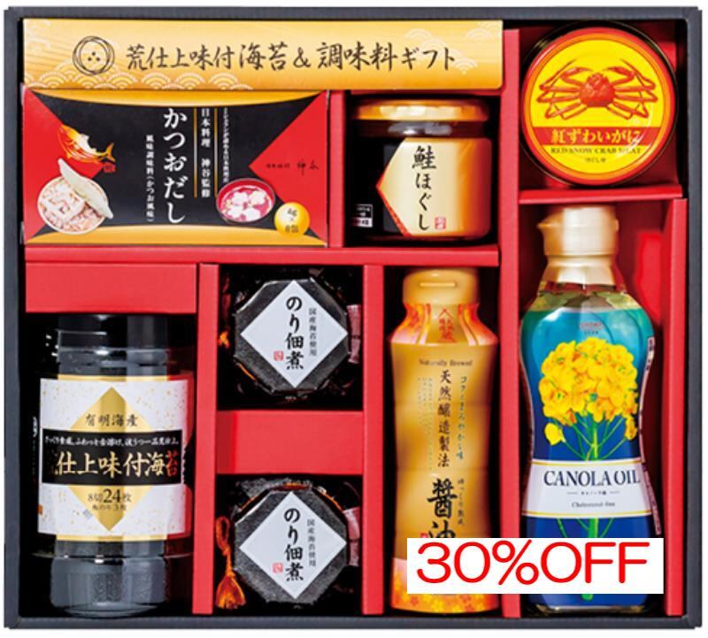 商品内容:内容/鮭ほぐし:50g×1・のり佃煮:80g×2・味付のり:8切24枚×1・かつおだし:4g×8袋×1・伊賀越 天然醸造醤油:200ml×1・昭和キャノーラ油:300ml×1・紅ずわいがにほぐし身:55g×1《乳・小麦・えび・かに》