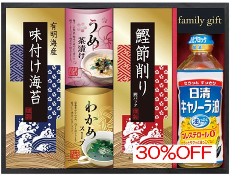 商品内容:内容/有明海産味付け海苔:3切6枚×1・うめ茶漬け:4.3g×2袋×1・わかめスープ:5.3g×2袋×1・鰹節削り:2g×4袋×1・日清キャノーラ油:400g×1《乳・小麦・えび》
