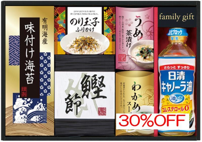 商品内容:内容/有明海産味付け海苔:3切6枚×1・のり玉子ふりかけ:4.5g×2袋×1・鰹節削り:2g×4袋×1・うめ茶漬け:4.3g×2袋×1・わかめスープ:5.3g×2袋×1・日清キャノーラ油:400g×1《卵・乳・小麦・えび》