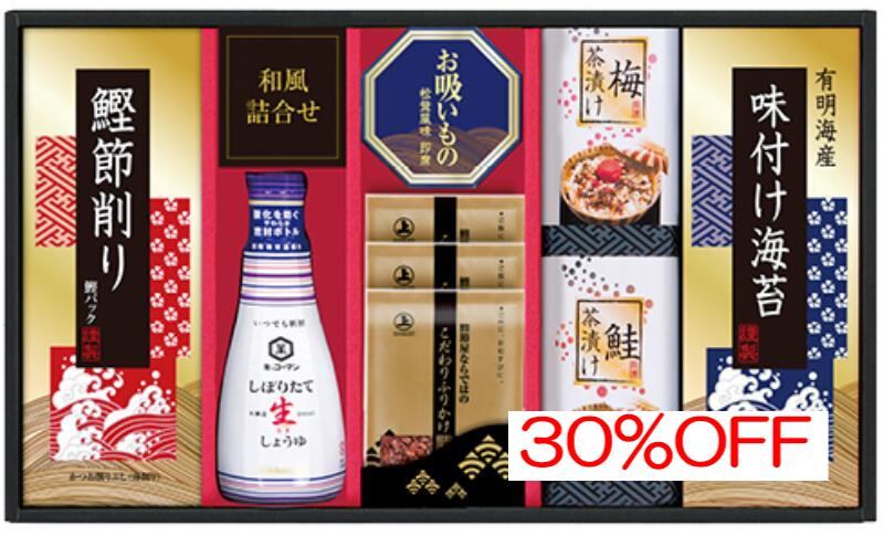 商品内容:内容/鰹節削り:2g×4袋×1・キッコーマンしぼりたて生しょうゆ:200ml×1・永谷園お吸いもの松茸風味:2.3g×2袋×1・こだわりふりかけ:6g×3・梅茶漬け:4.3g×2袋×1・鮭茶漬け:4.7g×2袋×1・有明海産味付け海苔:3切6枚×1《乳・小麦》