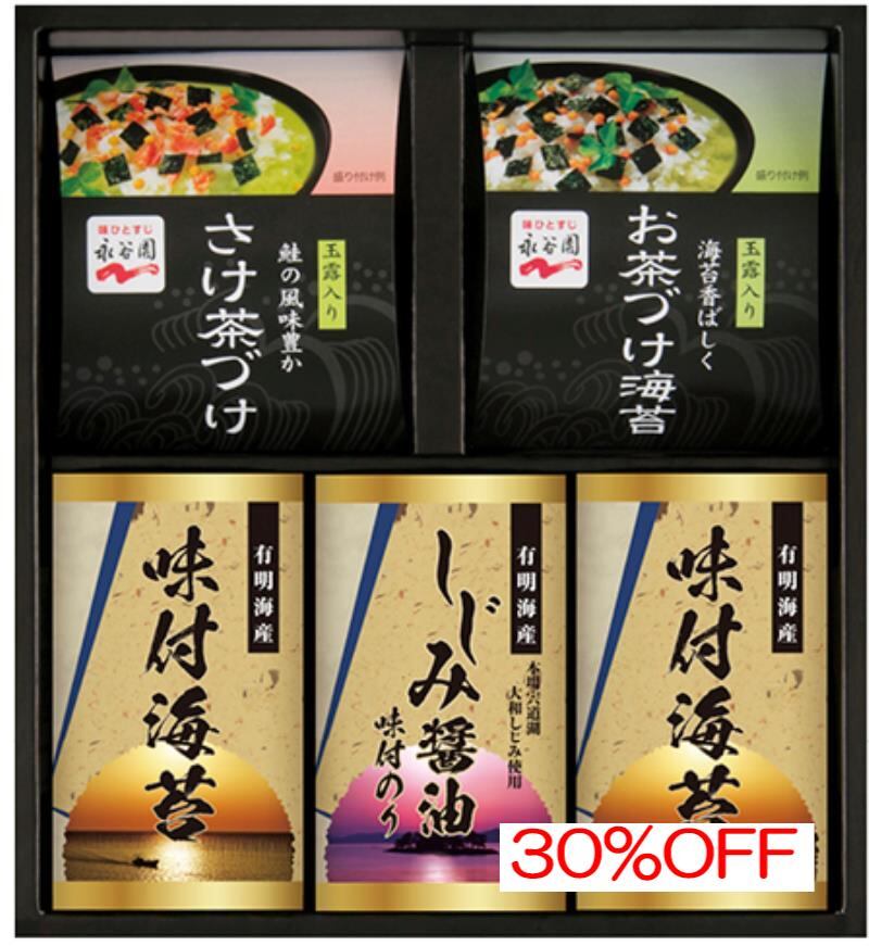 商品内容:内容/永谷園お茶づけ海苔:6.3g×3袋×1・永谷園さけ茶づけ:5.6g×3袋×1・有明海産味付海苔:8切24枚×2・しじみ?油味付海苔:8切24枚×1《小麦》