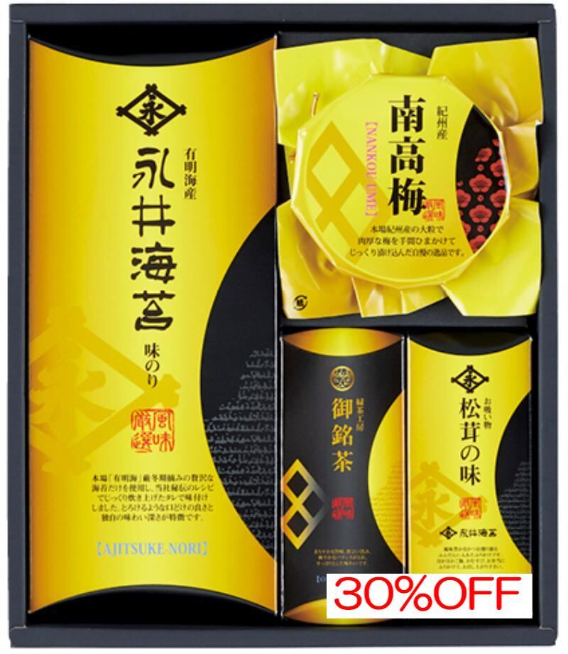 商品内容:内容/永井味付海苔:8切6枚×3袋×1・永井お吸い物:2袋入×1・深蒸し茶:40g×1・南高梅:100g×1《卵・えび・かに》