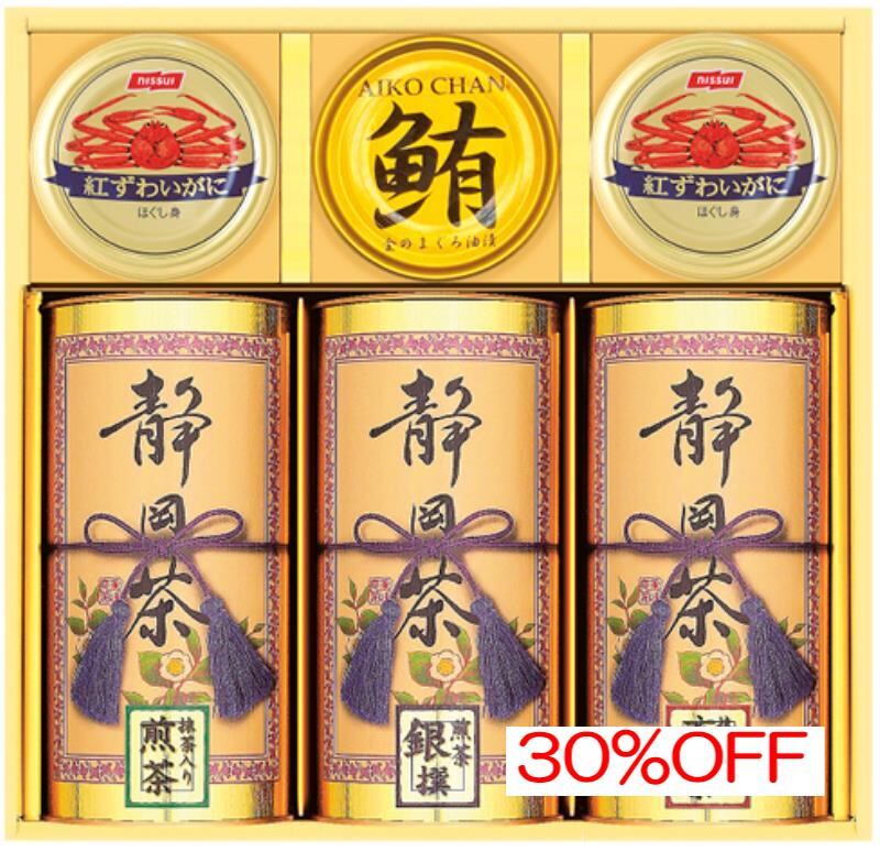 商品内容:内容/煎茶(銀撰):80g×1・抹茶入り煎茶:80g×1・抹茶入り玄米茶:80g×1・紅ずわいがにほぐし身:55g×2・鮪油漬フレーク:70g×1《かに》