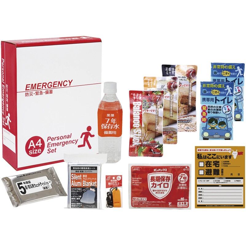 商品内容:バランススティック×3、携帯用トイレ×2、7年保存水(500ml)・カイロ・静音アルミブランケット・防災用ウェットティッシュ・緊急避難カード・ホイッスル×各1