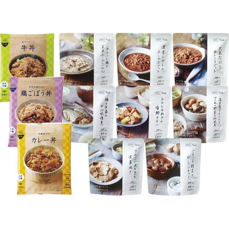 商品内容:出汁のきいた牛丼(365g)・和風出汁のカレー丼(310g)・大豆たっぷりカレーリゾット(300g)・きのこと鶏の玄米スープごはん・濃厚トマトのスープリゾット(各265g)・素材を活かした鶏ごぼう丼(250g)・名古屋コーチン入りつくねと野菜の和風煮(210g)・ごろごろ野菜のビーフシチュー(200g)・トロトロねぎの塩麹チキン(150g)・りんごが決め手の生姜焼き(145g)・梅と生姜のサバ味噌煮(135g)×各1★紙皿×3、スプーン×4付