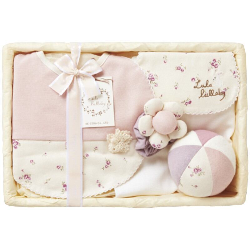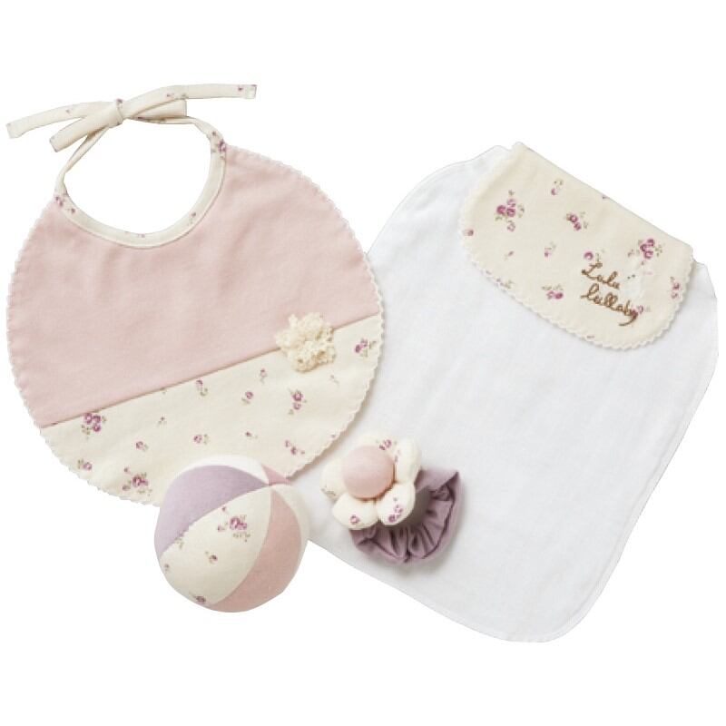 商品内容:花モチーフスタイ・汗とりパット・リストガラガラ・ボール・竹籠(20×29.5×7cm)×各1