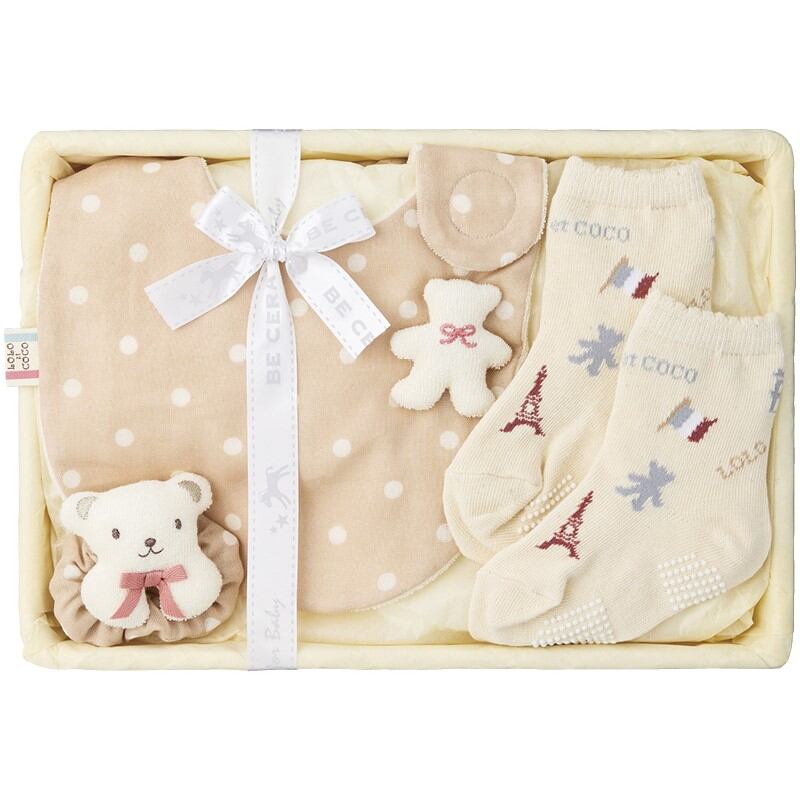 商品内容:クマモチーフ付スタイ・ソックス(11?13cm)・リストガラガラ・竹籠(20×29.5×7cm)×各1