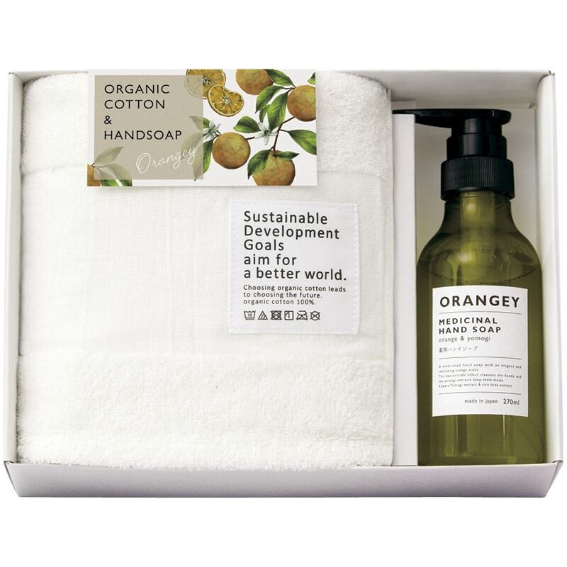 オレンジ&ハ−ブのこだわりフレ−バ−がふわっと香るハンドソ−プとオ−ガニックコットンタオルのおしゃれでやさしいギフトです。殺菌成分で清潔に、植物エキスで潤いも守る、洗い上がりにはオレンジ&ハ−ブがふわっと香るハンドソ−プORANGEY