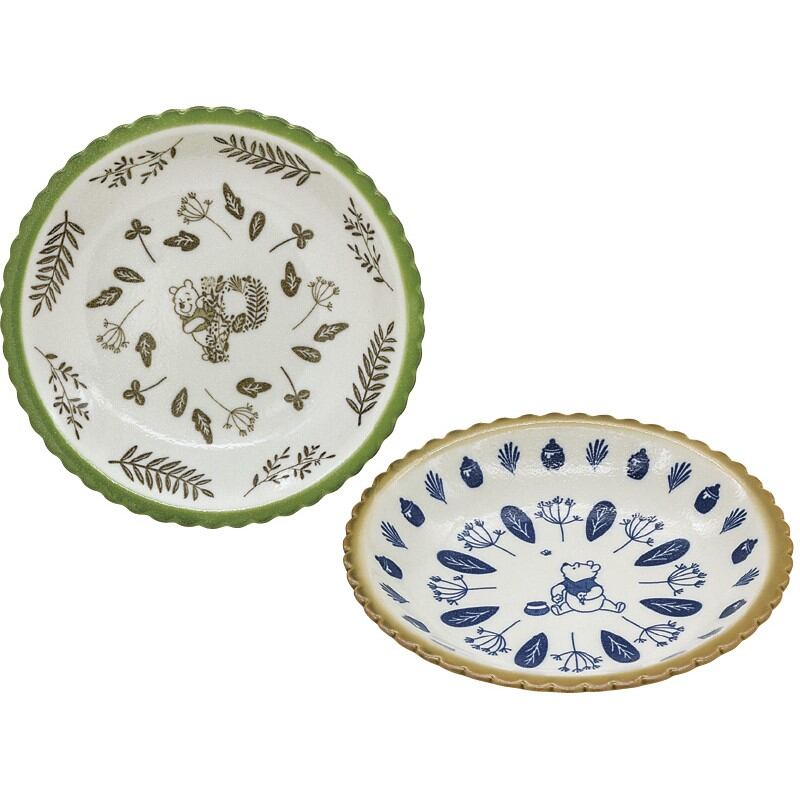 緑豊かな森の中で過ごす、くまのプーさんを描いたテーブルウェア。 さまざまな枝葉モチーフが、自然の恵みを感じさせます。リズミカルに小さなカーブを描く縁の形もユニーク。