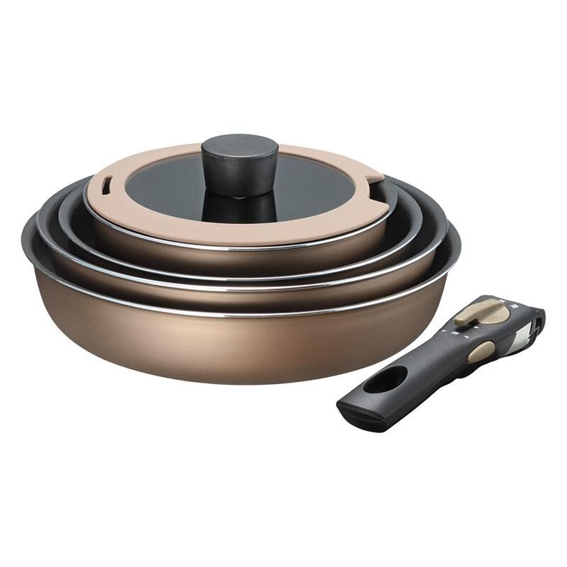 商品内容:鍋18cm(約1.9L)(約195×195×80mm)・フライパン26cm(約275×275×60mm)・いため鍋21cm(約225×225×70mm)・ディープパン24cm(約255×255×70mm)・ガラス蓋・着脱ハンドル×各1