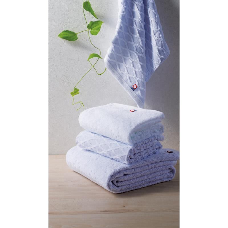 「輪奈」とは昔の言葉でタオルのパイル(ループ)のこと。吸水性、使いやすさとタオルの本質を守りつつ、今治の高いジャカード織技術により美しい輪奈織紋様に仕上げています。厳選された良質綿をブレンドし、日本の特殊紡績技術で紡いだふっくらやわらかな甘撚り糸を使用しています。