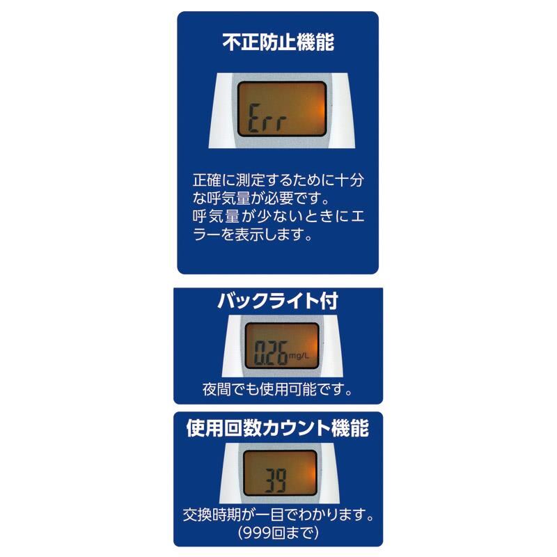 息を吹きかけるだけで簡単にアルコールチェック。電源:単四電池2本センサー:半導体式