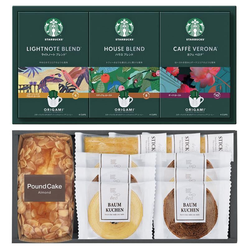 商品内容:スターバックスオリガミドリップコーヒー(ハウスブレンド・カフェベロナ・ライトノート×各4)・アーモンドパウンドケーキ×各1、バウムクーヘン(ココア・バニラ)・スティックパイ(プレーン)×各3