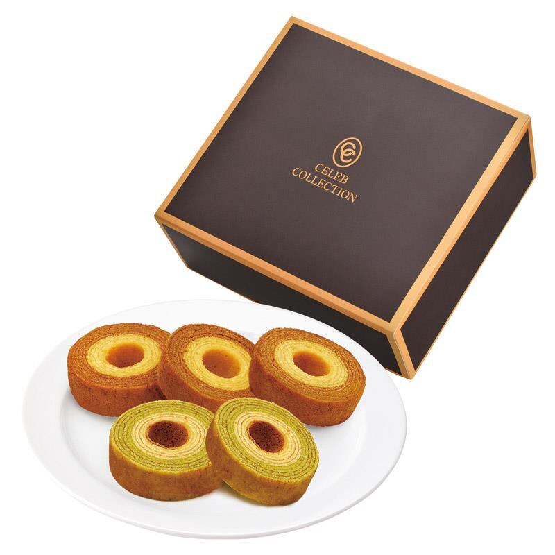 商品内容:2層バームクーヘン(キャラメル&ミルク×3、抹茶&ミルク×2)